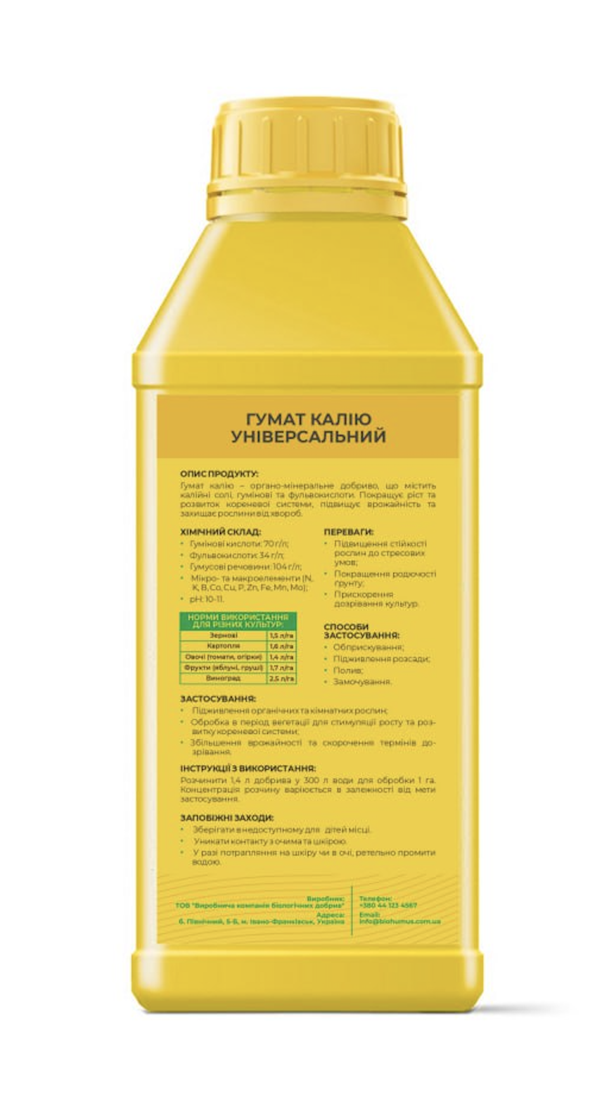 Гумат Калiю BioHumus — це природне джерело сили для ваших культур. Його регулярне застосування гарантує стабільний урожай, міцні та здорові рослини, а також родючий ґрунт на довгі роки.