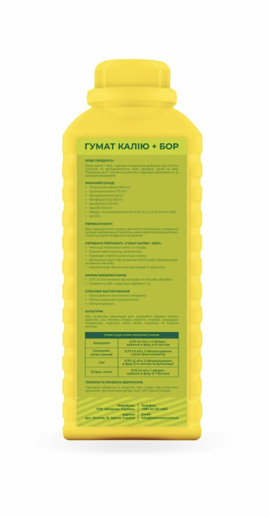 ХарактеристикиВиробник Biohumus Країна Україна Термін зберігання 2-3 роки (в залежності від умов) Умови зберігання +3 - 25°С, в темному, прохолодному місці Умови застосування +10 - 25°С Популярні товариНорми витратСоняшник 0,75–1,5 л/га Кукурудза 0,75–1,5 л/га Ріпак 0,75–1,5 л/га Соя 0,75–1,5 л/га Гречка 0,75–1,5 л/га Овочеві культури 0,75–1,5 л/га Картопля 0,75–1,5 л/га Плодові 0,75–1,5 л/га Виноград 0,75–1,5 л/га Опис🌿 ГУМАТ КАЛІЮ + БОР