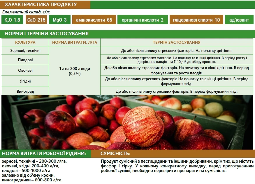 ХарактеристикиВиробник Ярило Країна Україна Популярні товариОписЯрило Імуностимулятор Са + – концентроване гелеве добриво для позакореневого застосування. Продукт виготовлено із кальциту, роздробленого на дрібні частинки, які легко проникають через продихи листка. Потрапляючи всередину CaCO3 розпадається на CO2 та іони Ca2+, які відразу стають доступними для рослини. Підвищення концентрації СО2 в рослинних клітинах призводить до зниження випаровування вологи за рахунок закриття продихів та покращення фотосинтезу. Кальцій зміцнює клітинні стінки рослин, що запобігає виляганню посівів. ПЕРЕВАГИ І ВЛАСТИВОСТІ ПРОДУКТУ Сприяє стійкості рослин до стресових факторів. Стимулює процес запліднення у рослин. Зміцнює клітинні стінки та підвищує стійкість до вилягання. Запобігає прояву фізіологічних хвороб. Покращує якість і лежкість плодоовочевої продукції.