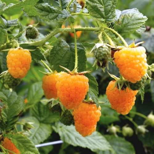 ХарактеристикиВиробник А-маркет Країна Ukraine Культура Малина Популярні товариОписМалина Жовте Чудо — ремонтантний сорт. Золотисті солодкі ягоди з невеликою кислинкою дозрівають на сильнорослому кущі двічі на рік. Перший урожай отримують на пагонах минулого року в липня, а другий — від початку вересня до перших заморозків, на молодих стеблах. Цей сорт характеризується пружною щільною м'якоттю, яка зберігається в холодильнику до 3 діб. За відгуками садівників, дерево малини не вимагає особливого догляду, крім формувальної осінньої обрізки. Опис Малина Жовте Чудо: кущ сильнорослий, з укривалими пагонами, до 2 м заввишки; ягоди жовті, на сонці з'являється рожевий бочок, форма конусоподібна, маса 6-8 г; смак солодкий, десертний, з ароматом лісової малини; середня врожайність — 5-6 кг із куща; морозостійкість до -25 градусів. Усі сорти жовтої малини добре ростуть на супячних і легкосуглінистих ґрунтах, не виносять важких і закислих. Для кращого розвитку саджанців знадобляться азотні підживки, до 3 разів за сезон. Можна раз на три роки вносити коров'ячий гній, до 3 кг на 1 м кв. а також підживлювати золом. Цікаво, що штамбова малина Жовте диво дає до 70% врожаю саме восени. Тому ягоди майже не пошкоджуються шкідниками та хворобами. Вирощування штамбової малини: саджанці жовтої малини висаджують у вересні-октябрі, на сонячній ділянці без застою води; посадка саджанців дерева малини виробляється траншейним способом, із шириною траншеї у 50 см і міжряджаннями 2 метри; глибина траншеї — 50 см, нижня нирка має бути трохи поглиблена в землю; в яму вносять перегний або компост (до 10 кг на 1 м. кв.) додають золу, кущ присипають ґрунтом, трамбують, поливають; потрібні поливи раз на тиждень (до 20 л під кущ), у перші 3 роки можна не удобрювати за умови внесення добрив під час саджання; навесні кущ обрізають, залишаючи від 4 до 7 пагонів, а восени прибирають пагони, які відплодували.