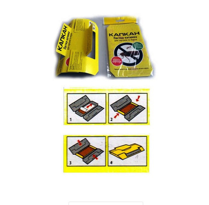ХарактеристикиВиробник А-маркет Країна Ukraine Тип Ловушка/уничтожитель насекомых Длина 175 Ширина 100 Популярні товариОписОПИС Будиночок-пастка для комах «Капкан» — універсальний НЕТОКСИЧНИЙ засіб для виявлення та вилову тарганів, мурах та інших комах, що повзають. Відрізняється високим ступенем прилипання, має привабливий запах і не містить отрути. Клейова будиночок-пастка «Капкан» проста у застосуванні та може бути встановлена у будь-якому місці, у тому числі у місцях зберігання харчових продуктів. Дозволена до застосування МОЗ України. Спосіб застосування пастки для тарганів «Капкан»: Акуратно відкрити пастку та відокремити папір, що закриває клей та скласти пастку. Встановити пастку в місцях ймовірного скупчення комах-шкідників та на шляху їх переміщення. Для досягнення кращого результату рекомендується використовувати кілька ловуць одночасно з розрахунку одна ловушка на 5-10 кв. м. Щодня оглядайте пастки, якщо протягом 2-3 днів не було виявлено жодного шкідника, необхідно перенести пастку в інше місце. Заміну пасток виробляють по мірі їх заповнення комахами-шкідниками.