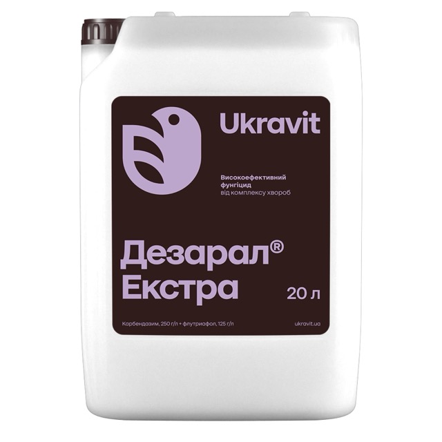 ХарактеристикиВиробник Укравіт Країна Ukraine Діюча речовина Карбендазим 250 г/л Діюча речовина Флутриафол 125 г/л. Діюча речовина Концентрат суспензії Спосіб Дії Контактний Спосіб Дії Системний Клас токсичності 3 (Помірно токсичні) Популярні товариНорми витратЗернові колосові культури 0,6 - 1,0 л/га Соняшник 0,8 - 1,0 л/га Рис 0,8 - 1,0 л/га Горох 0,6 - 0,8 л/га Буряки цукрові 0,6 - 0,8 л/га Соя 0,8 л/га Ріпак 0.8-1.0 л/га Пшениця озима 0,6 - 1,0 л/га Спектр діїТехнологія застосування: Дезарал Екстра 20л