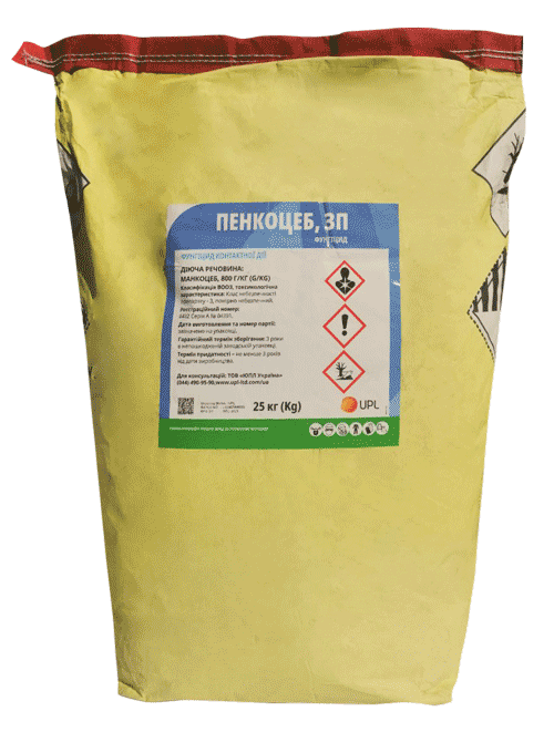 ОСОБЛИВОСТІ ЗАСТОСУВАННЯ:ПЕНКОЦЕБ застосовується як профілактичний фунгіцид до появи масових ознак захворювання. Період захисної дії, в залежності від погодних умов, складає 8-12 днів.