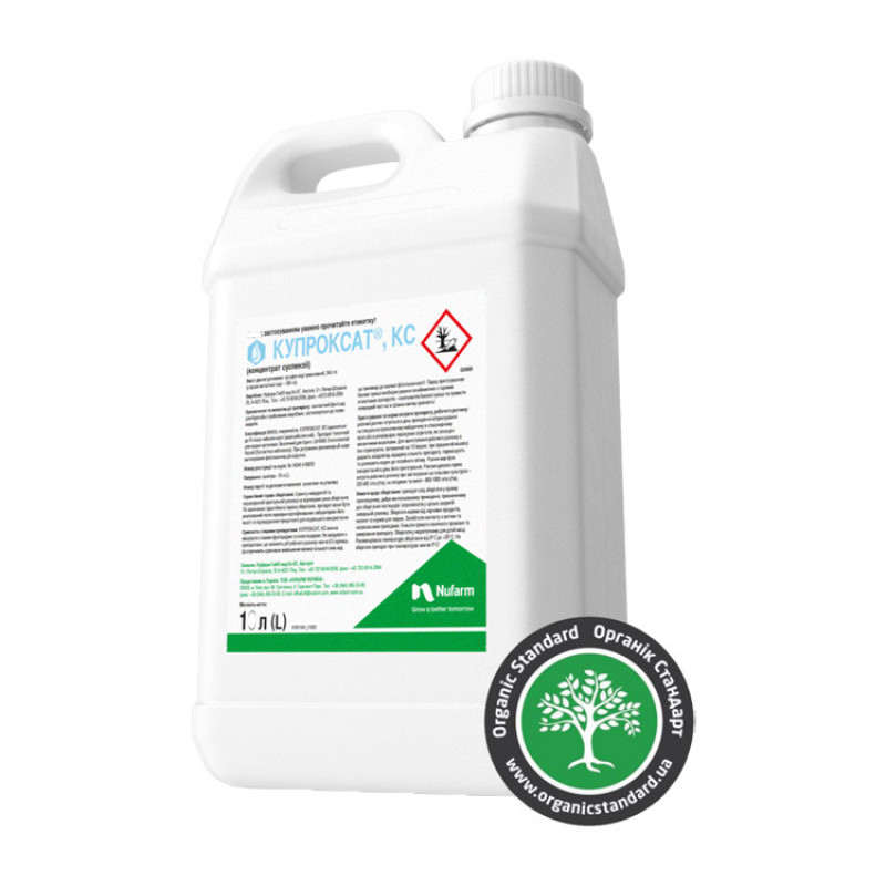 ХарактеристикиВиробник Нуфарм Країна Austria Діюча речовина Сульфат міді Форма Концентрат суспензії Популярні товариНорми витратВиноград 3,0 - 5,0 л/га Томати 3,0 - 5,0 л/га Картопля 3,0 - 5,0 л/га Хміль 3,0 - 5,0 л/га Яблуня 5,0 л/га Спектр діїКартопля фітофтороз, альтернаріоз Виноград мілдью Томати фітофтороз, альтернаріоз Яблуня парша Соняшник фітофтороз, альтернаріоз Соя фітофтороз, альтернаріоз Буряки цукрові борошниста роса, іржа, альтернаріоз, фомоз, пероноспороз, церкоспороз, рамуляріоз ОписНорма витрати препарату,(г,кг,л/га,м2,т) Культура, об’єкт, що обробляється Об’єкт, проти якого обробляється Спосіб, час обробок, обмеження Термін останньої обробки Макс. кратність обробок 3,0-5,0 ВиноградникиМілдьюОбприскування в період вегетації30 5 3,0-5,0 ХмільПіреноспорозОбприскування в період вегетації15 4 5,0 ЯблуняПаршаОбприскування в період вегетації15 5 3,0-5,0 ТоматиФітофторозМакроспоріозОбприскування в період вегетації8 4 3,0-5,0 КартопляФітофторозМакроспоріозОбприскування в період вегетації20 5 Контактний фунгіцид профілактичної та викорінюючої дії для захисту від грибкових хвороб яблуні, винограду, хмелю, картоплі й томатів.
