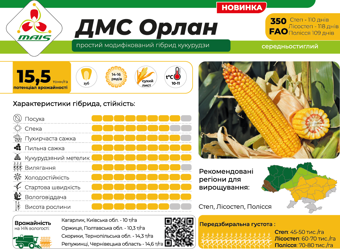 ХарактеристикиВиробник Маїс Дніпро Країна Ukraine Ступінь дозрівання Середньопізній Призначення кукурудзи Зерно ФАО 330 Популярні товариТехнологія захисту: ДМС Орлан 2025 рік(ФАО 330)