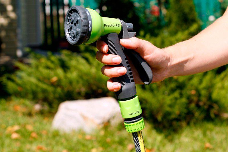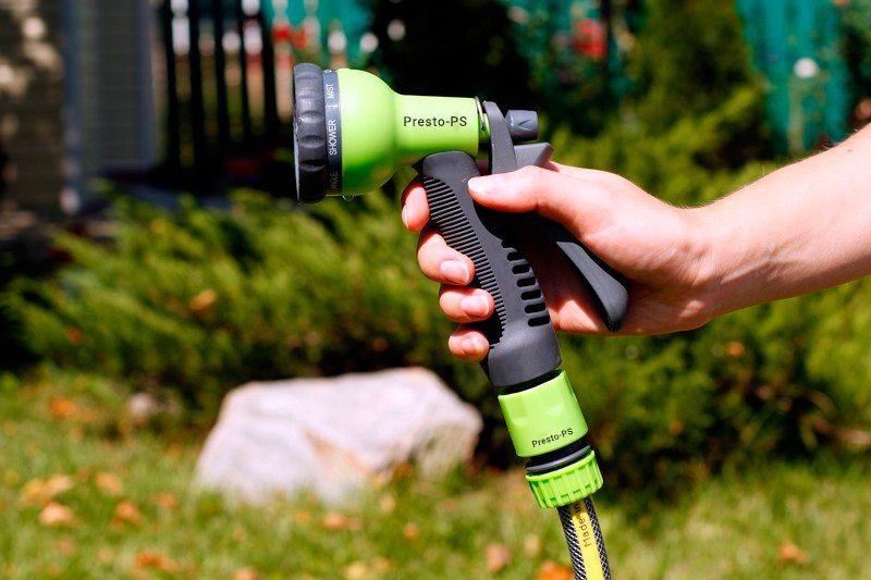 Пістолет для поливу Presto-PS (7202G) використовується для ручного поливу газонів середньої та невеликої площі, городів, квітників, прибирання доріжок на прибудинковій території, миття садового інвентарю та техніки. Поворотна головка пістолета має 8 положень і регулює форму струменя і ступінь розпилення води. Можливі режими поливу: м'який струмінь, дрібні струмені, кутовий, проливний дощ, душ, туман, плаский горизонтальний, конус. Підключається до садових шлангів діаметром 1/2, 5/8 і 3/4 дюйма за допомогою стандартних конекторів. Рекомендований робочий тиск у системі від 2 до 4 атмосфер. Виготовлений пістолет для поливу з якісного пластику, довговічний, стійкий до механічних пошкоджень, впливу ультрафіолету і водорозчинних добрив.