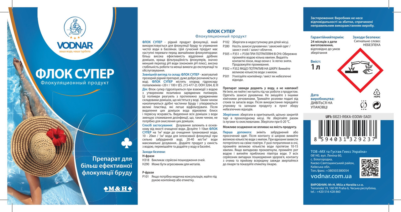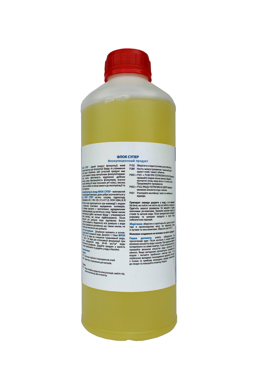 ХарактеристикиПроизводитель Senator Страна Ukraine Фасовка материала (л) 1 Форма поставки Жидкость Популярные товарыОписаниеФлок Супер ― современное высококачественное средства для быстрой очистки загрязнений бассейна , применяется для увеличения прозрачности воды и уменьшение мутности. По сравнению с подобными средствами этот современный препарат имеет следующие преимущества: лучший распад тонкой грязи, лучшая фильтрация загрязненных веществ, существенное уменьшение влияния на понижение уровня рН (что экономит средство для повышения уровня рН), высокая стабильность проведенного процесса и малые требования для обслуживания и эксплуатации продукта. Внешний вид и состав: Препарат произведен в виде желтой прозрачной жидкости представляет собой полиалюминий гидроксихлорид 40/100 (ES. 215-472-2, CAS. 1327-41-9). Действие: Препарат хорошо растворим в воде с образованием хлопьев из положительно заряженных полимеров, притягивают отрицательно заряженные частицы взвешенных загрязнений. Таким образом, в воде образуются хлопья коагулянта, содержащих загрязнения, и легко отстаиваются и фильтруются. Вода после удаления хлопьев становится чистой и прозрачной. Удаление взвешенных веществ из воды уменьшает затраты обеззараживающих средств. Инструкция по применению: Дозировка зависит, прежде всего, от качества воды. Используйте от 10 до 100 мл на 1м3 воды в соответствии с уровнем распространения загрязнения в воде бассейна. Максимально допустимая доза составляет 200 мл на 1м3 воды. Препарат дозируется в ведре с водой, размешивается и добавляется к воде плавательного бассейна. Меры предосторожности: Поскольку данный продукт находится в высокой концентрации, то необходимо избегать вдыхания паров, не глотать. Избегать попадания препарата на кожу, в глаза и органы дыхания. Соответствует закону Минздрава Чешской республики № 409/2005 относительно гигиенических требований к продуктам для очистки воды. Заключение Минздрава ДСЕС № 05.03.02-03/82261 от 29.10.2010 г. Препарат не входит в действующий перечень продукции, подлежащей обязательной сертификации в Украине (письмо от 23.07.2008 г. № 5-10/5-5199 ГП «УкрНИУЦ») Срок годности: 24-36 месяцев с даты изготовления и соблюдения условий хранения. По истечении срока годности препарат теряет необходимую способность по очистке воды.
