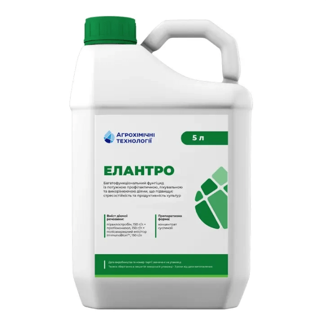 ХарактеристикиПроизводитель Агрохімічні технології Страна Ukraine Действующее вещество Піраклостробін Действующее вещество Протіоконазол Действующее вещество Полісахаридний елісітор ImmunoBionTM Способ Действия Системний Форма Концентрат суспензії Популярные товарыНормы затратПодсолнечник 0,5-0,8 л/га Рапс 0,5-0,8 л/га Спектр действияПодсолнух склеротиниоз, пероноспороз, септориоз, ржавчина, альтернариоз, фомоз, фомопсидоз Рапс альтернариоз, фомоз, пероноспороз, цилиндроспориоз ОписаниеФунгицид Элантро – это трехкомпонентный стробилуринсодержащий фунгицид профилактического, лечебного и искореняющего действия для комплексной защиты подсолнечника и рапса. Содержит пираклостробин (150 г/л), противооконазол (150 г/л) и полисахаридный элиситор ImmunoBion™ (150 г/л). Обеспечивает мощное действие против фомоза, фомопсидоза, альтернариоза, септориоза, ржавчины, склеротиниоза и пероноспороза. Оптимальная норма внесения – 0,5–0,8 л/га, с расходом рабочего раствора 150–300 л/га. Форма препарата – концентрат суспензии, тара – 5 л.