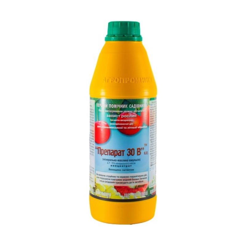 ХарактеристикиПроизводитель А-маркет Страна Ukraine Упаковка Пластиковый флакон Препаративная форма Масляный концентрат эмульсии Обрабатываемые культуры. Виноград Популярные товарыОписаниеПрепарат 30В - концентрированная минерально-масляная эмульсия для защиты плодово-ягодных и декоративных культур от зимующих стадий насекомых и клещей. Действующее вещество: концентрат минерально-масляной эмульсии 76% Вредные объекты: зимующие стадии щитовок, ложнощитовок, белокрылок, листоверток, тлей, червеца, медяницы, молей, клещей и личинки щитовок (бродяжек) в летний период Культуры: плодово-ягодные и декоративные культуры, виноград Описание, особенности использования: Препарат 30 В обладает высокой эффективностью в борьбе против зимующей стадии вредителей: нарушает воздушный и водный баланс развития яиц личинок и приводит их к гибели. Одним из важнейших свойств препарата является то, что вредители не могут адаптироваться к такому воздействию, поэтому Препарат 30В является высокоэффективным ежегодно. После уничтожения яиц и личинок вредителей ранней весной растение пробуждается и развивается в полную силу. Применение Препарата 30В: ранневесенняя обработка до распускания почек; наилучший эффект - это обработка в фазе набухших почек; осенняя обработка при температуре не ниже 4°С (круглосуточно) после опадания листвы; летняя обработка по выходу бродяжек 2 и 3 поколения. Обрабатывать нужно тщательно, не оставляя пропущенных участков. Во время цветения плодово-ягодных деревьев обработка запрещена. Обработки рекомендуется проводить в утренние или вечерние часы в безветренную погоду. Опрыскивание должно быть обильным с тем, чтобы основательно смочить ветви со всех сторон. Перед применением взболтать. Для получения раствора необходимо препарат воду и хорошо перемешать. Рабочий раствор необходимо использовать в течение 2 часов. Норма расхода препарата: плодовые деревья - 300-400 мл на 10 л воды, ягодные кустарники и декоративные деревья - 300 мл на 10 л воды, виноград - 200-300 мл на 10 л воды. При летнем опрыскивании расходуют 200-250 мл препарата на 10 л воды. Норма расхода рабочего раствора: плодовые деревья от 2 (молодые) до 10 л (взрослое дерево) , ягодники - 1-2 л на куст, цитрусовые - до 5 л на дерево, виноград - до 1,5 л на 10 кв.м. Период защитного действия препарата длится 5-10 дней. Срок ожидания: 20 дней.
