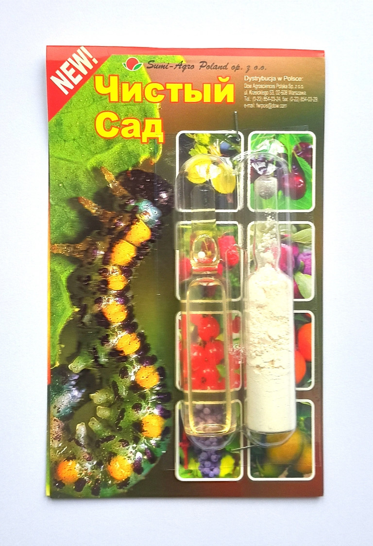 ХарактеристикиПроизводитель А-маркет Страна Ukraine Химический состав Неорганические Популярные товарыОписаниеДвухкомпонентный препарат Чистый Сад применяется для комплексной защиты плодовых деревьев против большинства видов насекомых-вредителей и патогенных организмов. Данное средство выполняет функции фунгицида и инсектицида. Препарат содержит в составе имидаклоприд и фунгицид. Механизм действия препарата заключается в блокировании поступления импульсов в центральную нервную систему насекомых, в результате чего у них развиваются конвульсии и паралич, приводящий их к гибели. Эффект воздействия наблюдается в течение 3-5 дней после обработки и длится до 3-х недель. Благодаря действию фунгицида, средство Чистый Сад быстро останавливает рост мицелия и дальнейшее развитие грибковой инфекции. Комбинированный препарат эффективно применяется для лечения и профилактики яблони, груши, персика, вишни, сливы, черешни, абрикоса, винограда от антракноза, серой гнили, пятнистого некроза, бактериального рака, аскохитоза, парши, милдью, оидиума, ржавчины, мучнистой росы, пятнистости листьев; а также от вредителей: тли, белокрылки, трипса, листовертки, плодожорки, цветоеда, листогрызущих гусениц, пилильщика, моли, а также растительноядных клещей. Преимущества комбинированного препарата Чистый сад Инсектицид в составе препарата эффективно уничтожает яйца, личинки и взрослых особей насекомых-вредителей Универсальный препарат Чистый Сад выполняет функции инсектицида и фунгицида Инсектофунгицид обладает длительным периодом защитного действия - до 3-х недель Средство не фитотоксично и не наносит вреда окружающей среде Данный препарат не вызывает резистентности у насекомых-вредителей Инструкция применения и норма расхода концентрата Чистый сад 2 ампулы по 5 мл Вредители Болезни Норма расхода препарата Тля, филоксера (листовая форма), скосори (долгоносики), паутинный клещ, листогрызущая гусень, листовертки, трипсы и др. Милдью (ложномучнистая роса), оидиум (мучнистая роса), антракноз, сирая гниль, пятнистый некроз, бактериальный рак, вирусная мозаика. Растворить содержимое 2-х ампул в 10 л воды. Раствор тщательно перемешать и обработать культуры.